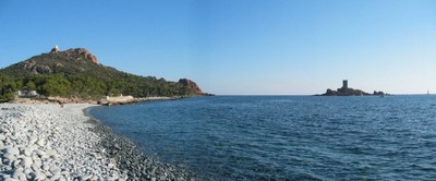 pointe du Dramont. En face de la plage du Dramont la tour de l'ile